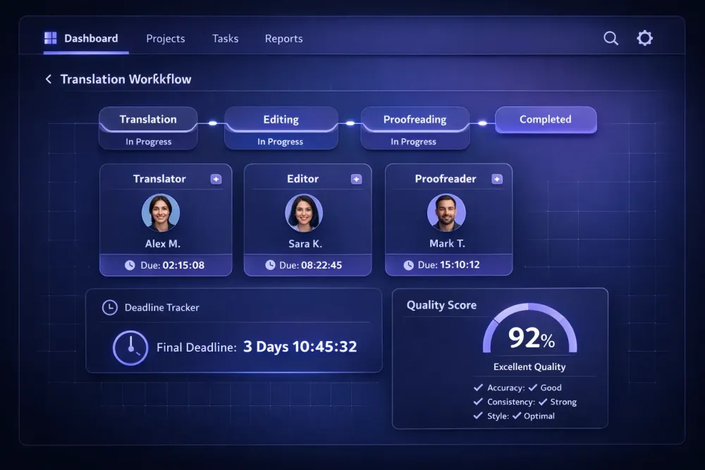 Most agencies use a combination of a project management tool and a spreadsheet for this. For agencies handling more than fifty projects per month, a dedicated translation project management system pays off in coordination time saved. For smaller agencies, a well-structured spreadsheet works — as long as it's maintained.